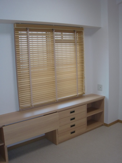 洋間の壁面に並べられていた高さや幅が不ぞろいの家具を取払い、オーダー家具ですっきりさせたいとご依頼がありました。梁と梁の間に造り付けられた巾2m45cm奥行き35cm高さ69cmの収納棚を造作。机は跳ね上げ式の天板で、使用しないときは折りたためて邪魔にならないものにしました。引き出しや棚も充分にあるので、一目でわかりやすく、散らかりやすい小物もすべて収納可能。窓には木製のブラインドをつけて、やさしい雰囲気のすっきりしたお部屋が完成しました。