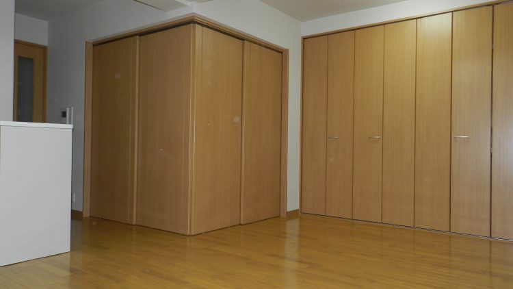 LDKと隣接する和室をなくしてリビングとして使いたいが、一部、間仕切りのついた部屋が欲しいとのことでした。押入れを3枚シンクロ引戸をとりつけてクローゼットにリフォーム、必要な時に間仕切れる引き戸を付けました。壁いっぱいのクローゼットを設け、様々な物の収納を助けてくれます。垂れ壁が取払われたリビングは視界を遮るものがなくなり、広々としたすっきりした広々空間になりました。